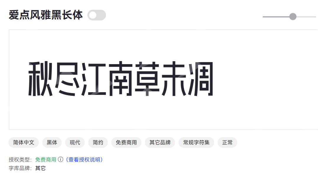 爱点风雅黑长体是一款纵向拉伸的黑体变体,字形修长优雅,笔画简洁有力,具有现代时尚感,比较适合竖版排版。所以非常适合一些竖版海报,同时也适用时尚杂志、手机界面等场景。