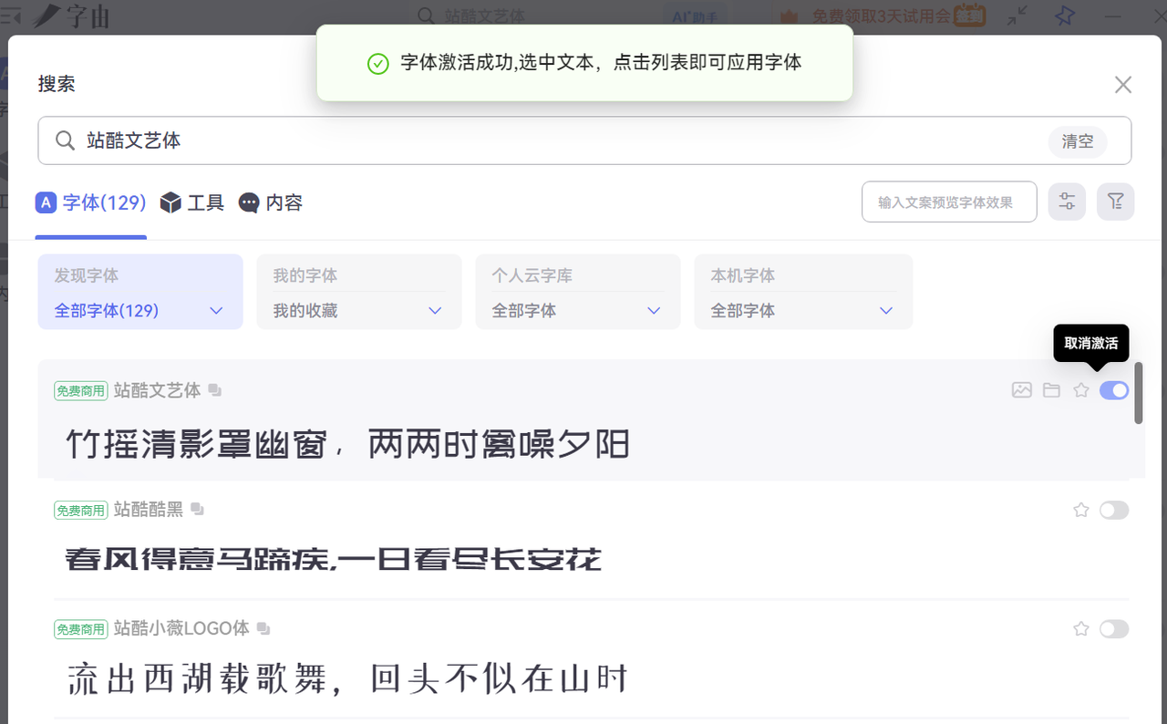 如果比较喜欢上面的海报字体,不用一个一个的下载安装,只需要下载字由客户端,就可以快速获取和使用上面的海报字体。比如站酷文艺体,你只需要在字由客户端激活这款字体,然后可以一键替换字体。
