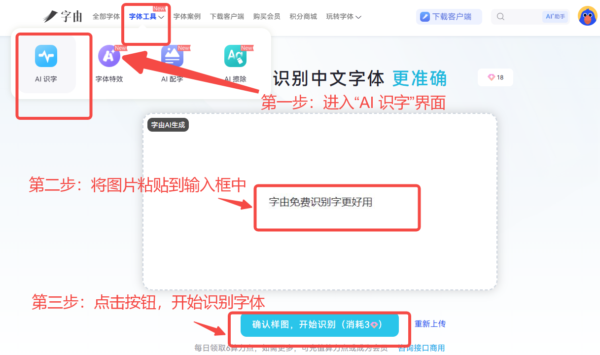 - 第一步:通过字由的官网导航栏中的 【字体工具】进入到 “AI 识字” 界面,将需要识别字体的图片粘贴到输入框中。