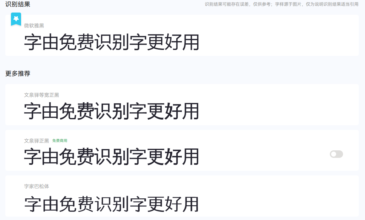 - 第二步:等待几秒后,字由就会为你呈现字体识别的结果,同时会给出一定的字体相关信息供你参考。如果是字由站内已经收录的字体,那么字由还会为你提供字体使用的入口,让你能一站式完成识字和用字。此外,字由还会在下方为你推荐一些其它类型的字体素材供你挑选。
