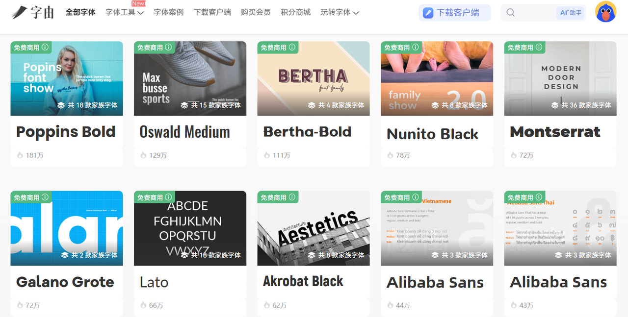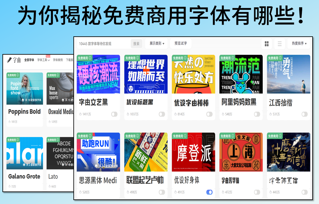 以上就是本文对于 “免费商用字体有哪些” 的全部介绍内容了,本文为大家列举了设计师工作中常用和热门的中文,英文字体,当然,本文列举的这些字体素材并不是全部,只是选了一些比较有代表性的出来为大家举例。如果想了解更多支持免费商用的字体,可以去文中提到的字体网站中查看。就比如文章提到的【字由】,它站内汇集了 3000+ 支持免费商用的字体,让你可以一站式完成查找字体与使用字体!
