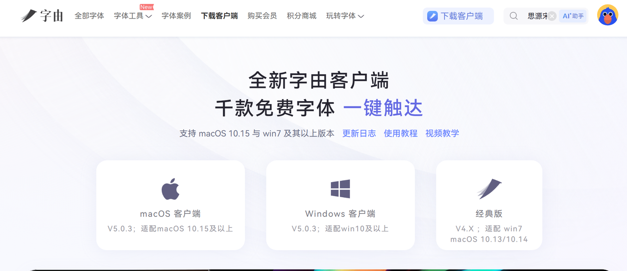 接下来教给大家如何使用字由网的各种字体。首先,先打开电脑浏览器,搜索“字由网”,进入官网后,首页上方的菜单栏就能看到“下载客户端”的按钮,点击进去,根据自己的电脑系统(Windows还是Mac),选择对应的版本下载就好,下载速度挺快的,不用等太久。