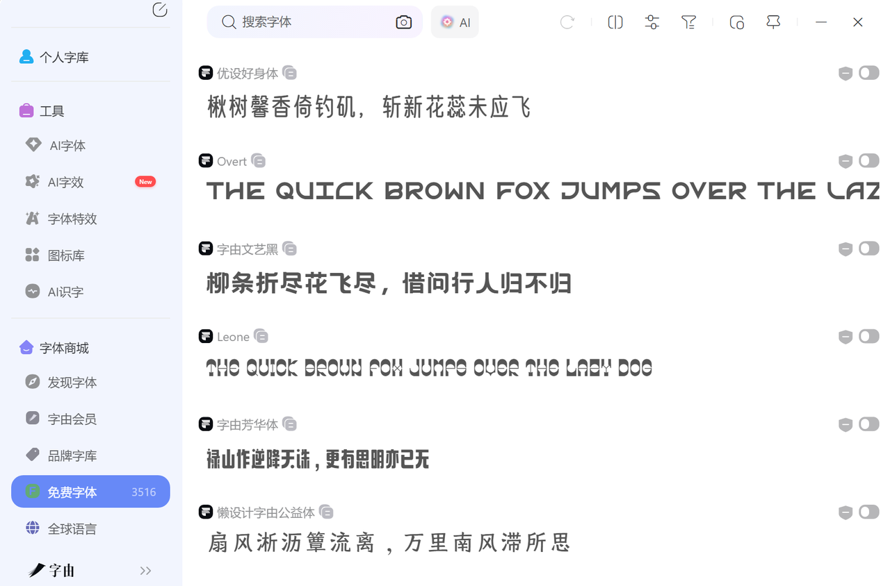 客户端安装好之后,打开它,注册登录好账户后,就能直接查看和使用免费商用的字体,具体操作很简单。先打开字由客户端,首页左侧菜单栏会显示各种分类,大家点击左侧的“免费字体”分类,就能筛选出所有可以免费使用、还支持商用的字体;如果知道具体想要的字体名称,比如“思源黑体”“优设标题黑”,也可以在顶部搜索框输入,快速找到目标字体。
