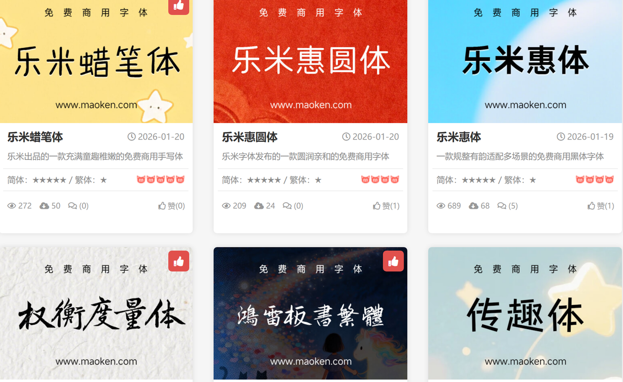如果说字由网是全能选手,那猫啃网就是中文免费字体的“宝藏专场”,专注于中文免费商用字体,是很多新手创作者的入门首选。网站界面极其简洁,没有多余的广告弹窗,打开就能直接搜索字体,分类清晰明了,按字体风格、用途、作者进行划分,甚至专门做了“新手推荐”“热门字体”板块,就算是第一次使用,也能快速找到自己需要的字体。字体安装包体积小,下载速度快,安装步骤简单,适配各类办公、设计软件,尤其适合需要大量使用中文字体的人群。