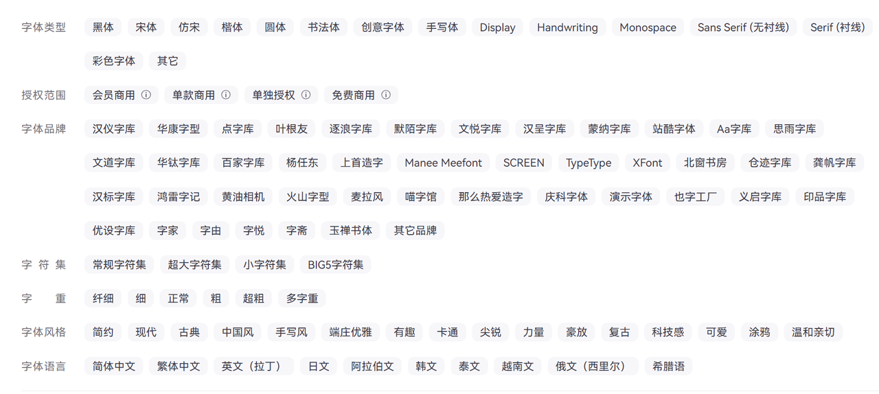 ① 免费字体包数量庞大,分类清晰 字由目前收录超过10000款字体,其中有相当数量可直接免费使用,涵盖中文黑体、宋体、书法体、手写体,以及英文衬线、无衬线、装饰字体。你可以按风格(简约/可爱/现代/复古)、按品牌快速筛选出最合适的字体包,极大节省选字时间。