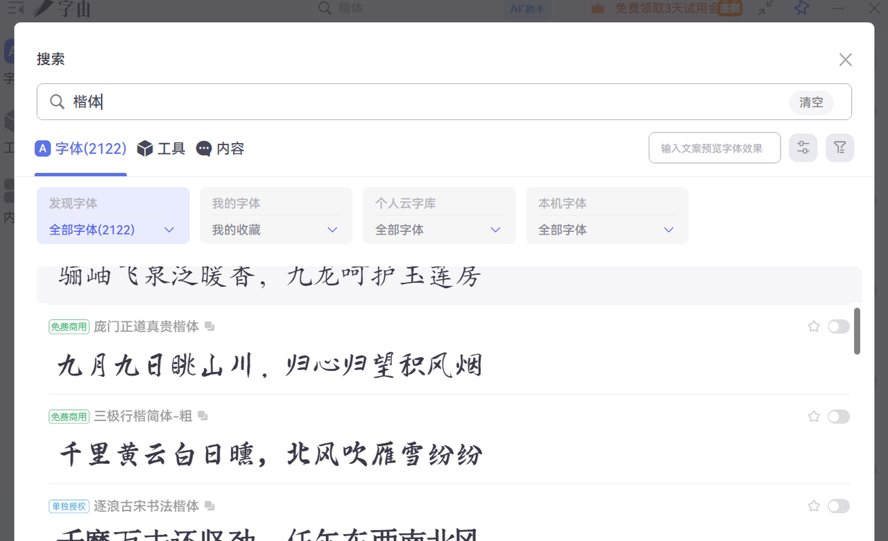 在正式分享免费商用的楷体之前,告诉大家这些字体快速的获取方式。就是下载字由客户端,在客户端中搜索楷体,就能看到免费商用的字体了,除了本文介绍的 6 款,还有很多,一定能够满足您对楷体字体的需求。