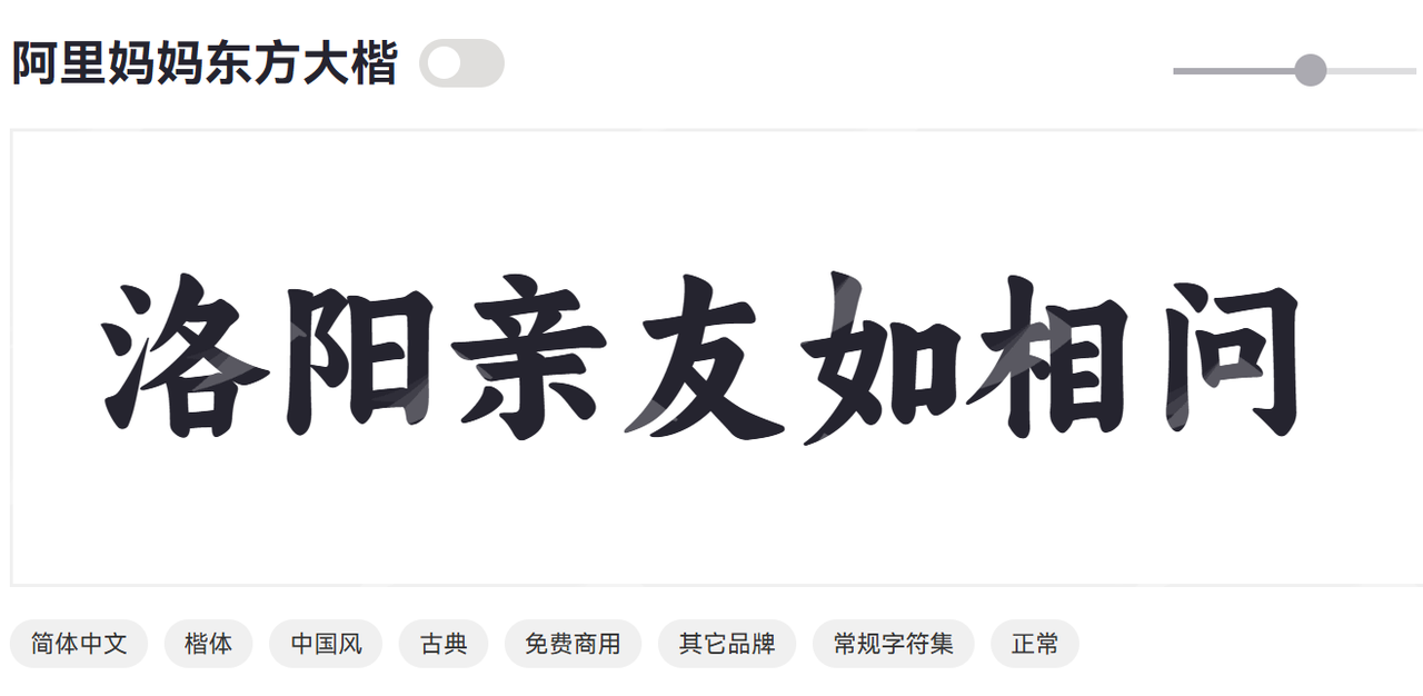 东方大楷,作为阿里免费字体的楷体字体,也是我推荐的老朋友了,阿里妈妈东方大楷拥有传统楷书的方正结构、横平竖直的笔画特点,字体骨架严谨,笔力雄厚。整体风格沉稳、大气,给人以庄重、权威之感。