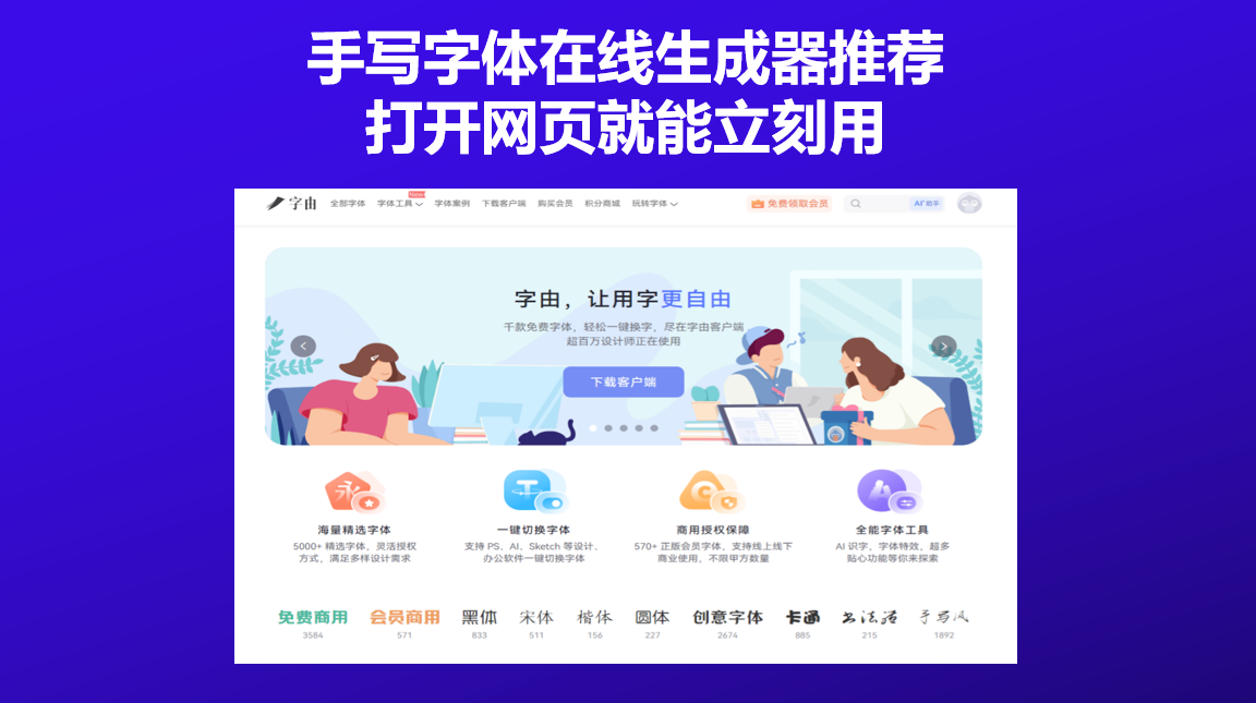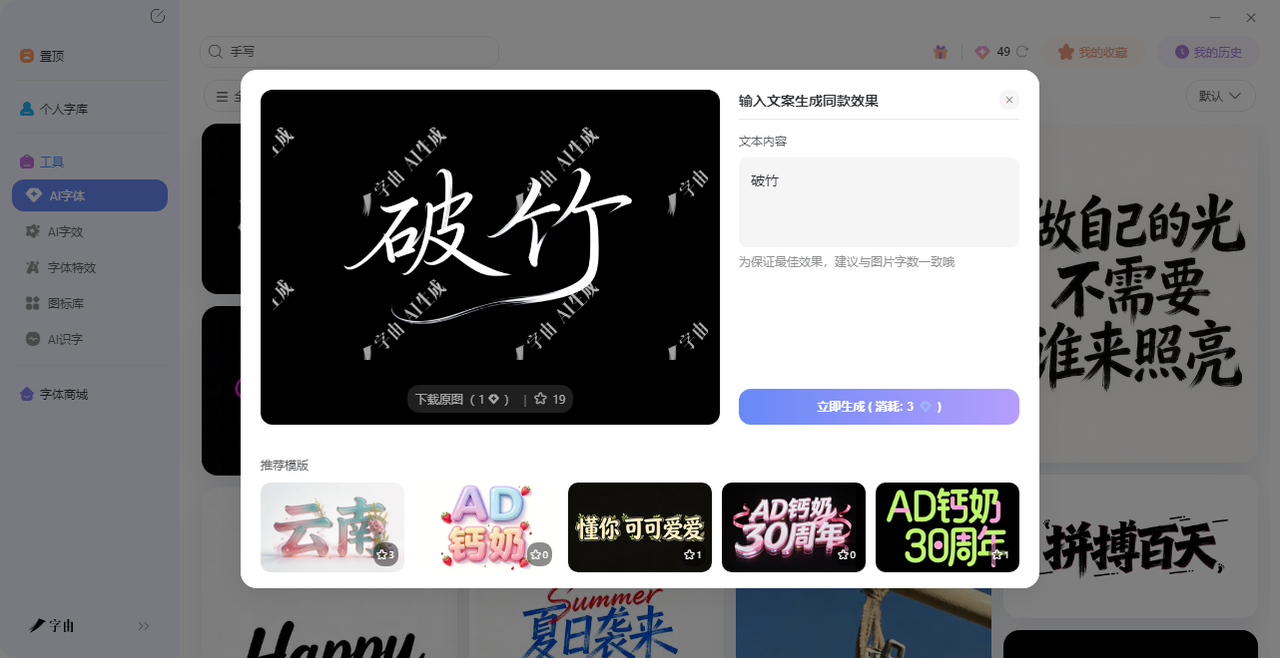 字由的“AI字体”功能,是我用过最顺手的手写字体在线生成器。它不只是一个字体库,更是一个能直接生成手写艺术字的工具。你不需要会书法,也不用懂设计,输入文字,选个手写模板,几十秒就能拿到一张逼真的手写体图片。