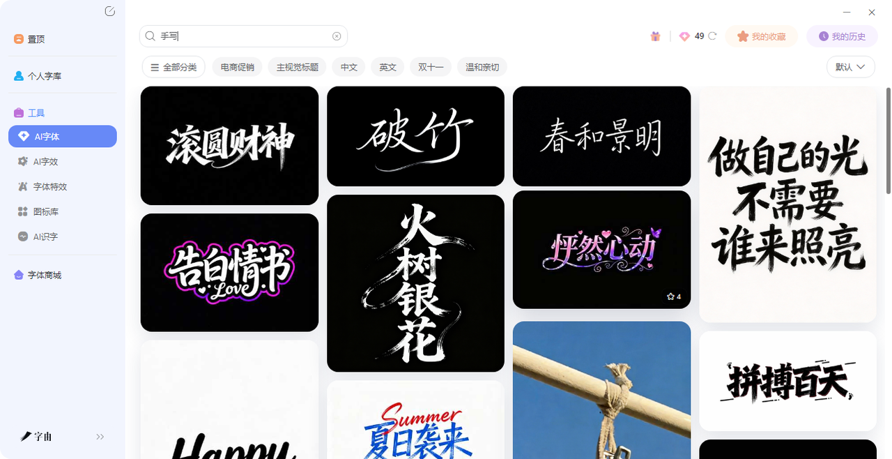 第一步:打开字由客户端或网页版,进入【AI字体】页面。在搜索框里输入“手写”“毛笔”“墨迹”“笔触”,系统会筛出一批带着手写痕迹的模板。这些模板不是单纯的字体,而是把文字做成了像用毛笔、钢笔、水彩笔写出来的效果——有墨迹的浓淡,有笔锋的飞白,有纸纹的肌理。