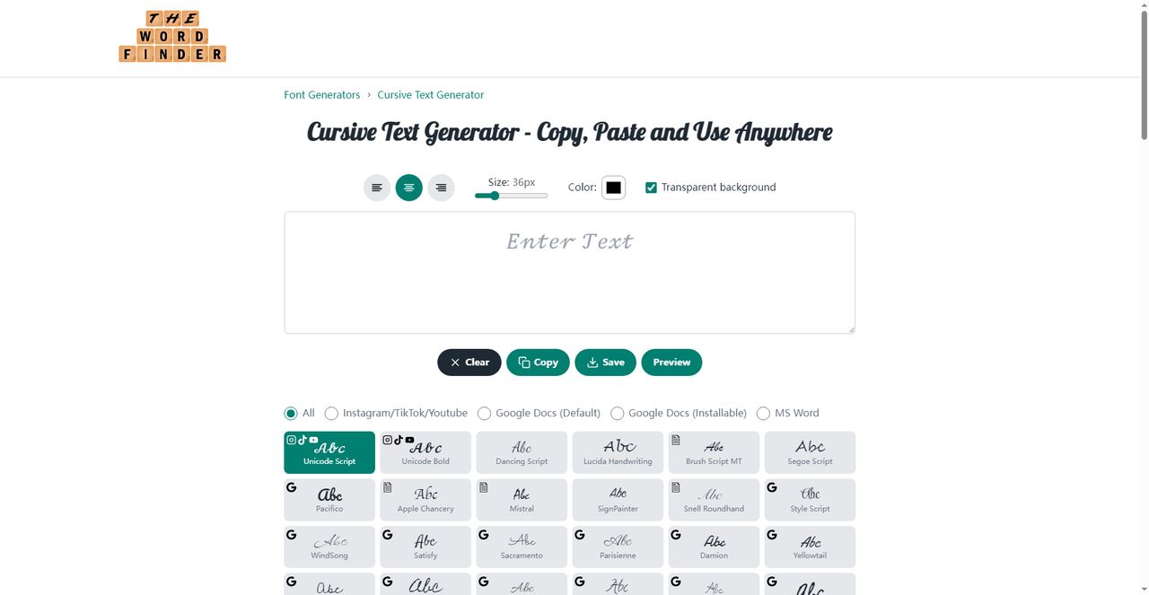 它不生成图片,而是把普通文字转换成各种花式手写字体,然后让你直接复制粘贴。打开网页,在输入框里打字,下面会列出十几种手写风格的字体预览,比如“ABC Unicode Script”“ABC Dancing Script”“ABC Lucida Handwriting”等。你可以调整字体大小和颜色,还能选透明背景。点击“Copy”按钮,就能把转换后的文字复制到剪贴板。直接去微信、微博、Instagram 粘贴,不用保存图片。适合做社交媒体文案、评论区签名、个性昵称。它还有专门针对Google Docs和MS Word的字体选项,如果你在用这些软件写东西,可以直接套用。