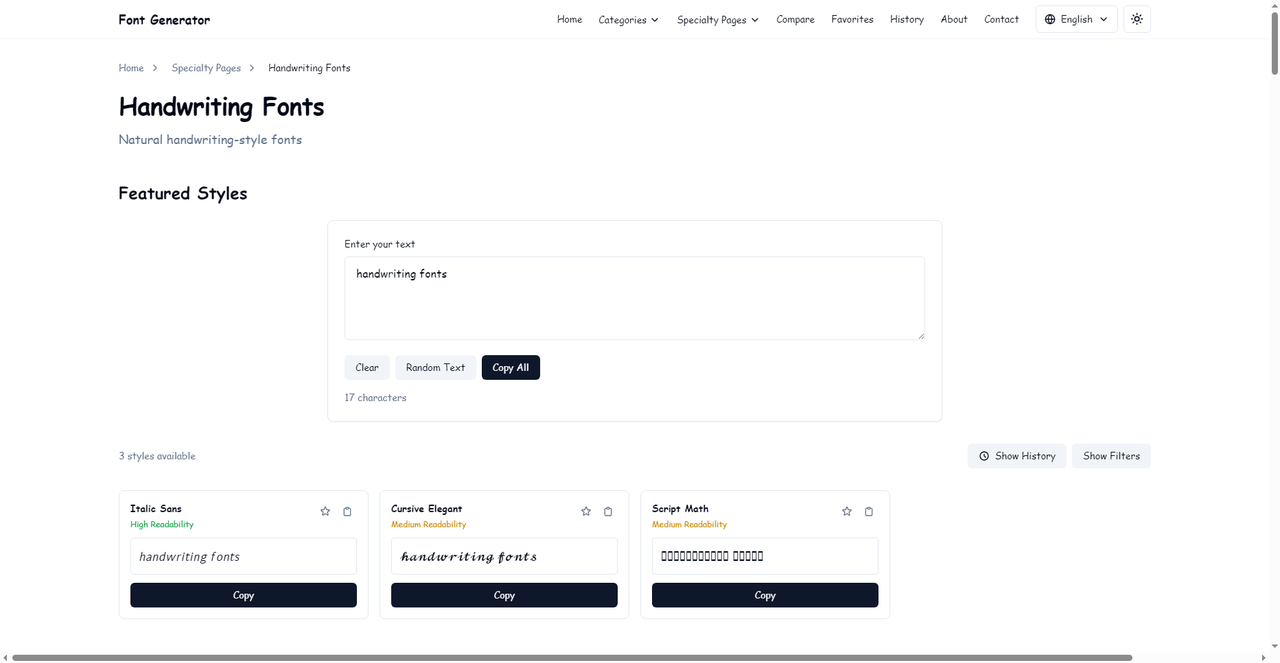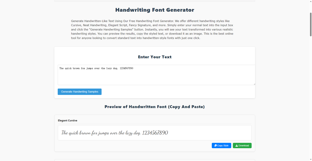 这个工具功能很全面。输入文字后,点击“Generate Handwriting Samples”,它会一次性生成多种手写风格的预览,比如“Elegant Cursive”“Neat Handwriting”“Childish Writing”等。它还提供了“随机文本”功能,不知道写什么的时候点一下,自动生成示例文字。另外还有历史记录,你之前生成过的样式会保存下来,方便下次再用。
