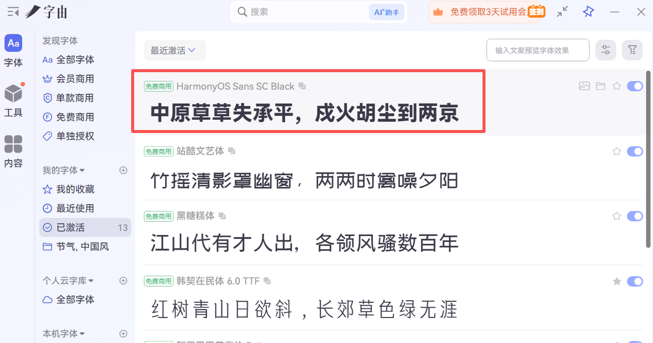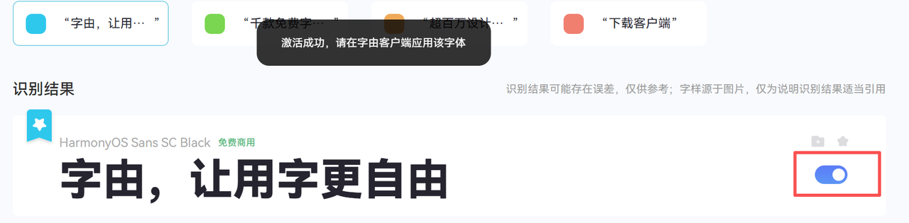 如果我们想下载这款字体也非常的方便,我们只需要一个字由账号,点击右侧的激活按钮即可。