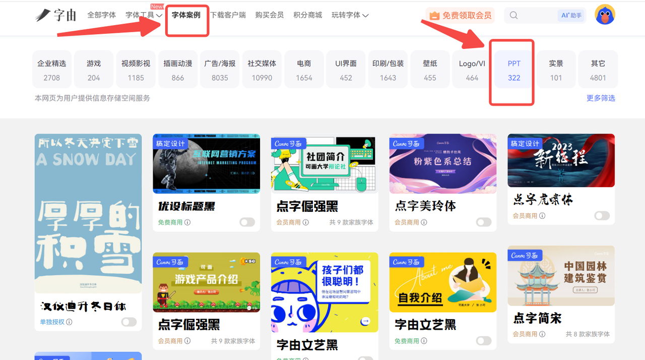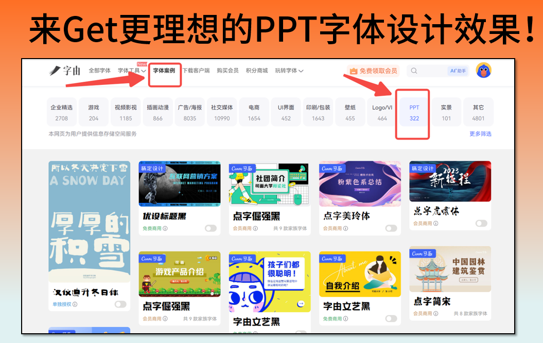 如果面对上万款字体素材,不知该如何下手的话,不要着急,字由还有另一个好用的功能可以帮助你。打开字由官网后,我们可以访问导航栏中的【字体案例】区域,这里按设计场景分类提供了或许更合适你使用的字体素材。我们将设计场景选为 “PPT”,之后在下方就能看到官方推荐的在 PPT 设计中更常用,更好用的字体素材。