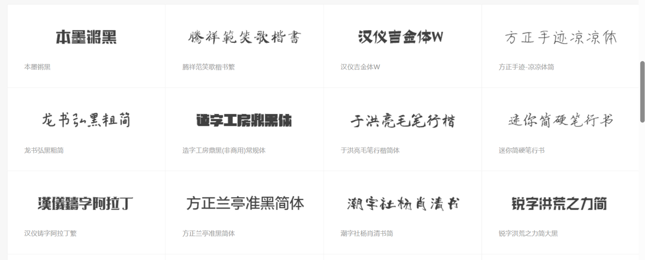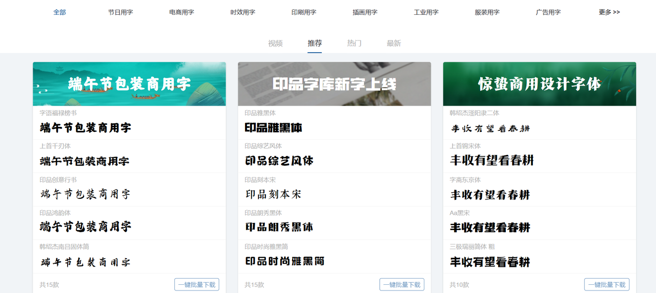 字体视界也是一个非常有名的字体网站了,如果是专业做设计的朋友,在工作中很有可能用到过这个字体网站。它站内的字体并不是按字体特色来分类,而是按字体用途划分的。所以访问官网后,在查找字体时,我们就能看到网站导航上列出的 “节日用字”,“电商用字”,“印刷用字”,“广告用字” 等等,这个功能和字由的【字体案例】有点相似,本质上都是为了方便用户更快地找到理想的字体。