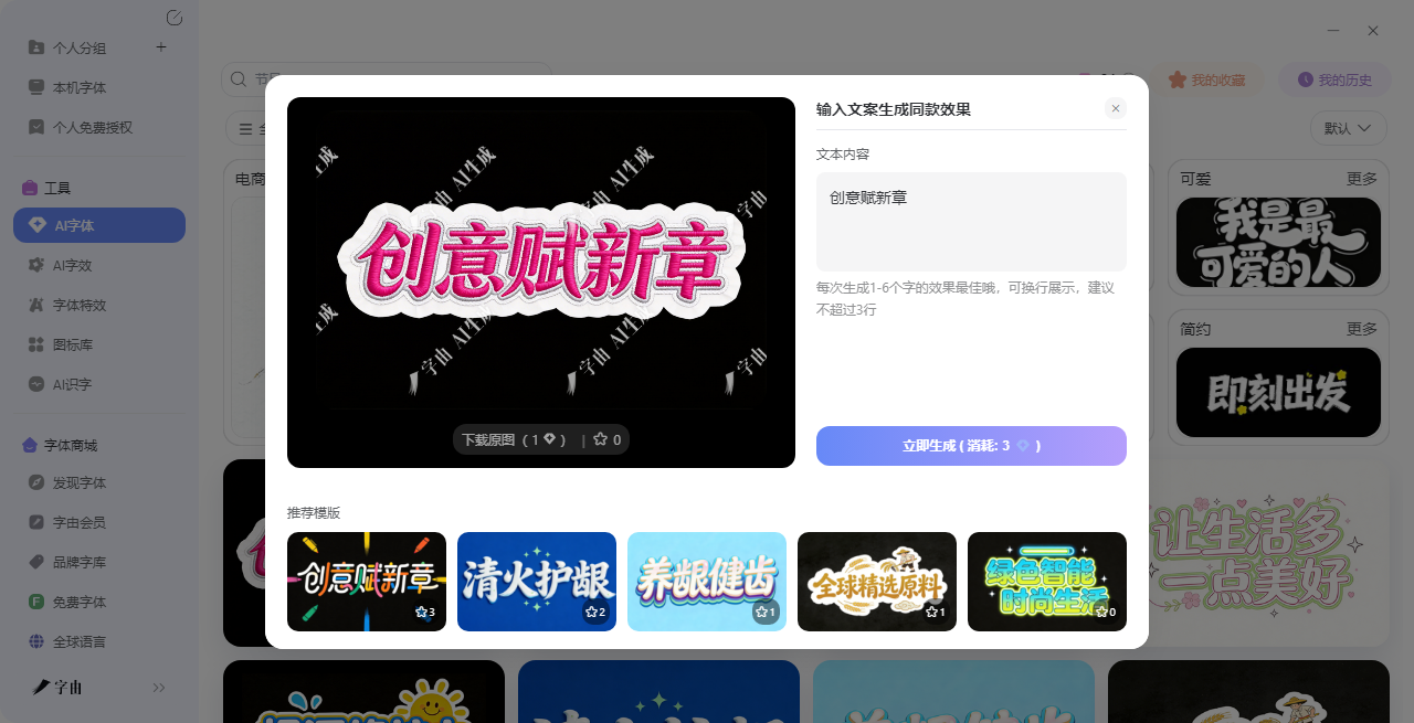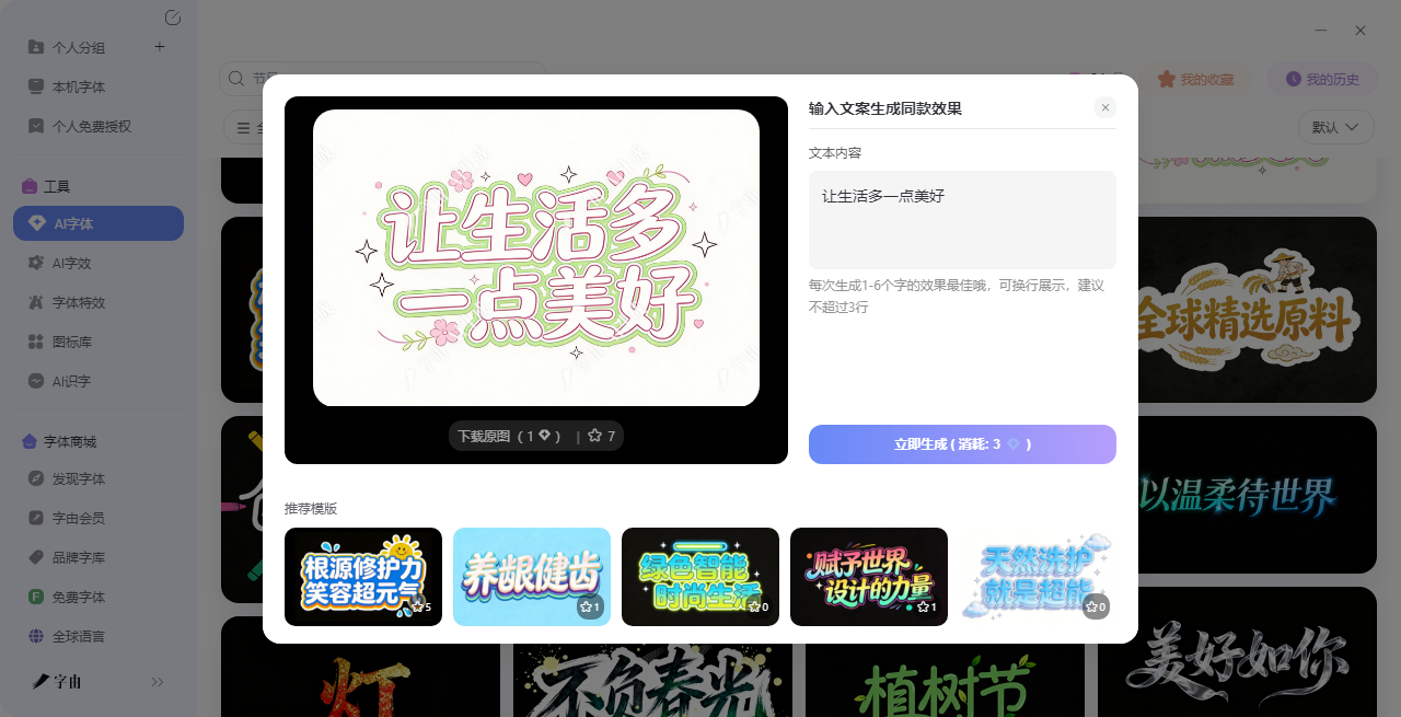 打开字由客户端,进入AI字体页面,你会看到一个搜索框和密密麻麻的模板预览图。在搜索框里输入你的文案,比如“春日限定”,然后开始浏览模板。鼠标滑过一个模板,预览图里就会立刻用你的文案展示效果。点进去,还能看到更大的预览。这个过程没有任何延迟,你不需要等待下载,不需要纠结“这字体适不适合”,看一眼就知道。