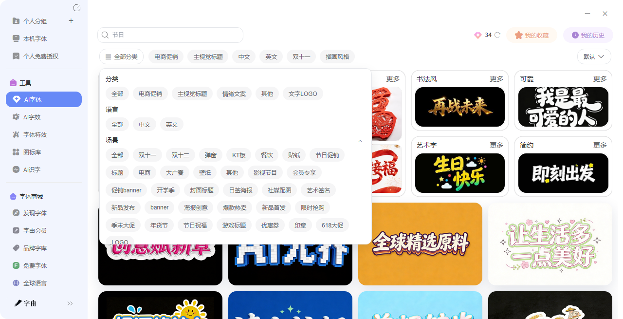 - 按用途:节日、活动、品牌、文案、封面、字幕……