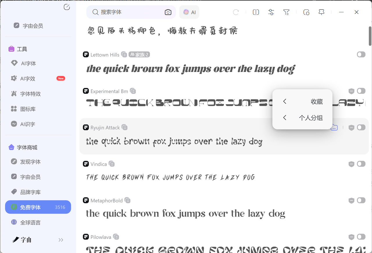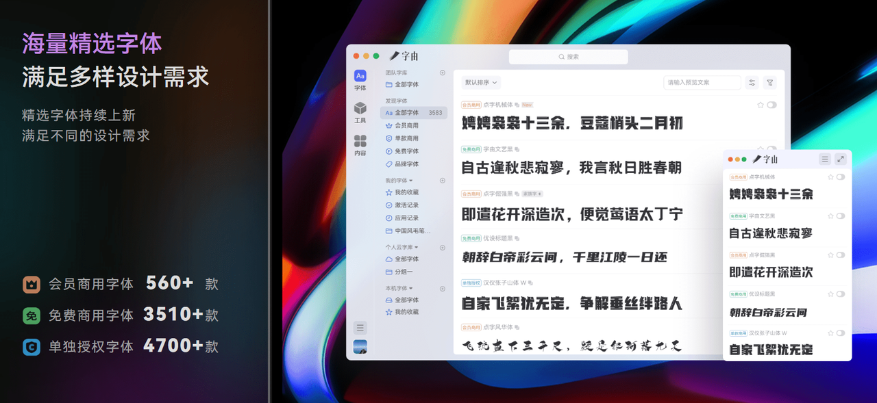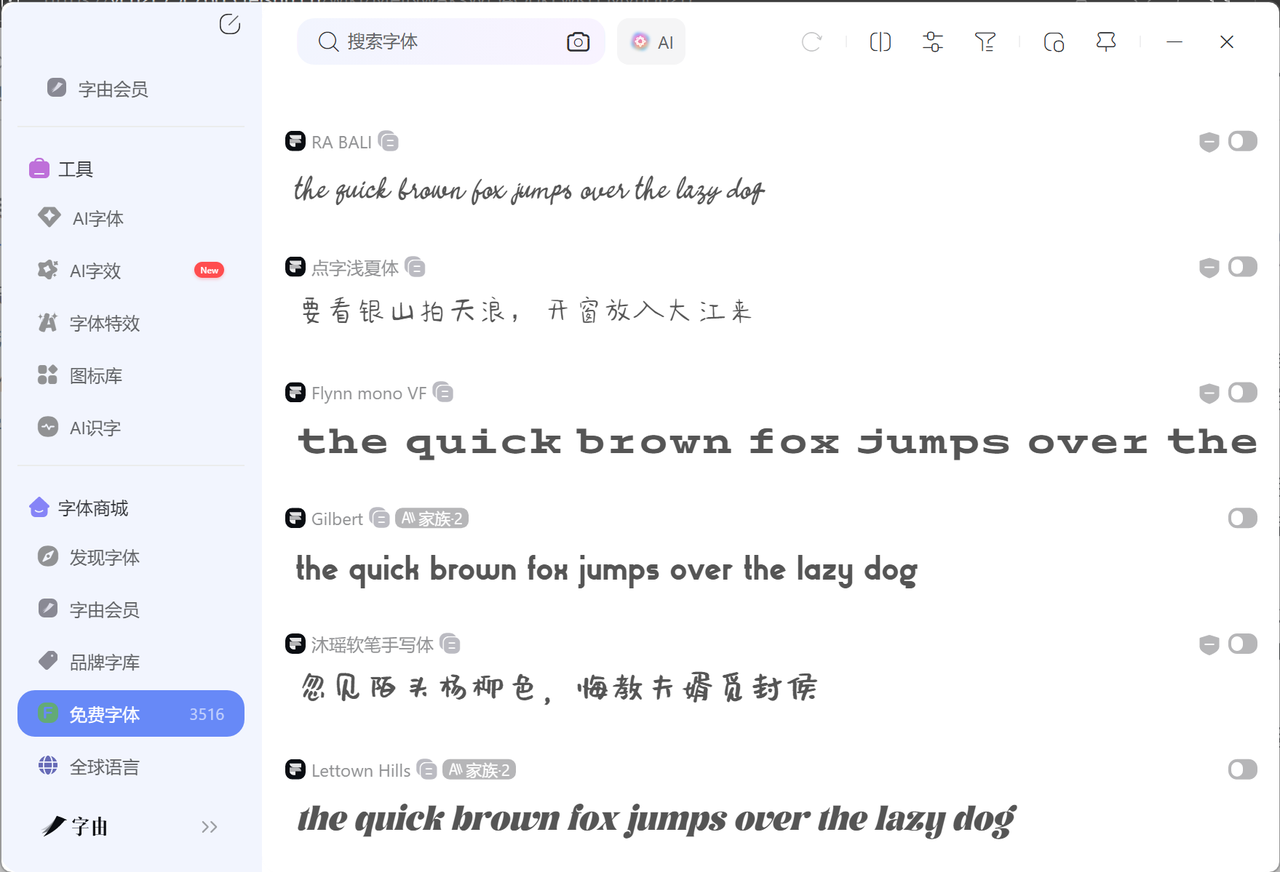 第二步,打开客户端并注册登录好个人账户后,直接点击左侧菜单栏中“免费字体”分组,就能看到所有可放心商用的字体,也可以用顶部搜索框输入字体名称或风格快速查找。找到心仪的字体后,点击字体右侧的灰色按钮,变成绿色就说明激活成功了,激活就相当于我们平时的安装操作,特别方便。