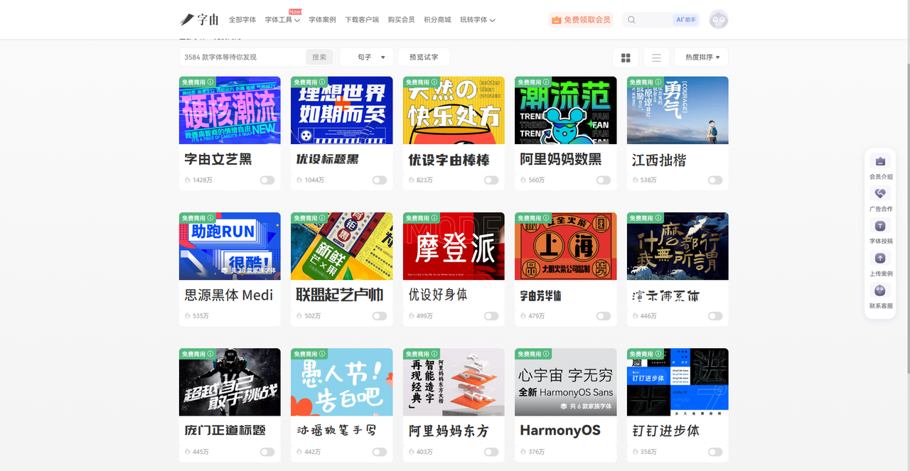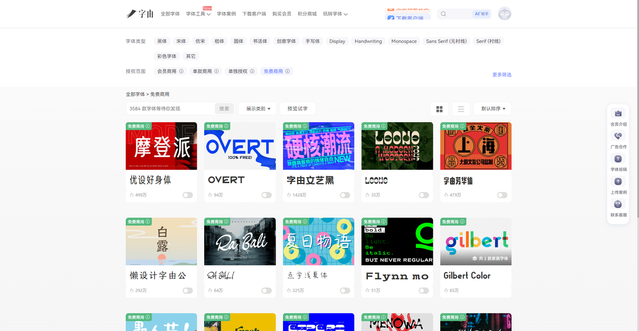 另外,我还想给大家推荐一下目前字由上比较热门的字体,我选了“可免费商用”的标签,如果你在里面有喜欢的可以直接下载来用,无需担心版权问题。