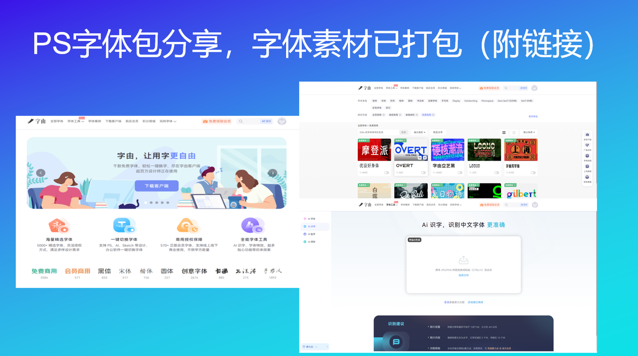 先来介绍一下我最喜欢的这款字体网站吧,字由是一个集字体库、字体管理和设计辅助于一体的平台,目前注册用户超2000万,是很多设计师电脑里的必备工具。它和普通PS字体包最大的不同,在于它不是简单的“下载站”,而是一个“字体工具箱”——你不需要一个一个下载字体,打开客户端就能直接调用5000 多款字体。如果你经常用的话我推荐你下载字由的客户端,这样很多功能都可以得到解锁,用起来会更加便捷。