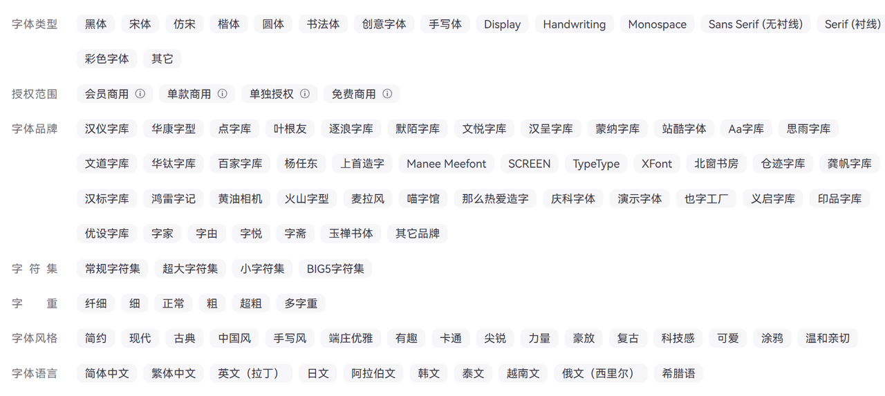 如果只推荐一个中文字体平台,字由是绕不开的名字。字由目前收录上千款中英文字体,说起来可能没什么感觉,但它的分类体系才是真正体现诚意的地方。除了常规的风格分类(黑体、宋体、楷体、手写、书法……),字由还做了字体风格标签,比如:简约 / 现代/ 古典/中国风 / 手写风......选字的时候不用从头想"什么风格适合这个项目",直接按字体风格筛,出来的结果大多数时候已经在对的方向上了。对于接案子的设计师来说,这个功能在赶稿状态下能省下不少脑力。