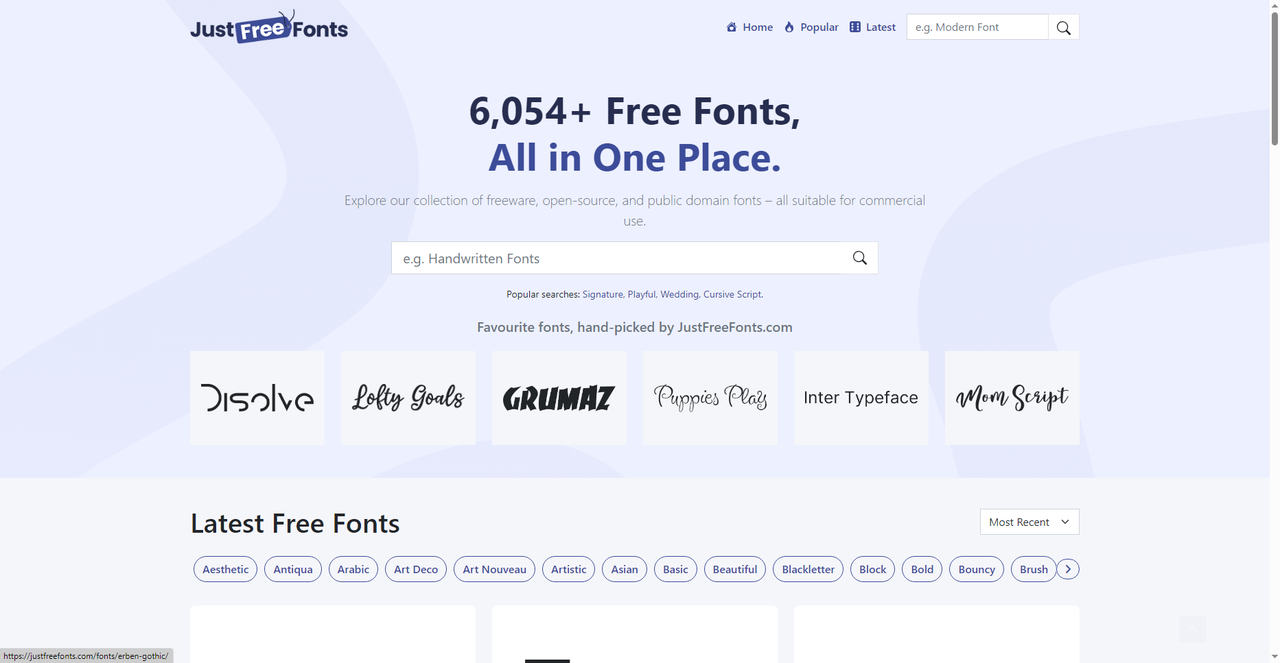 JustFreeFonts 的首页写着6000多款免费字体,全部适合商用。这个定位非常清晰,就是帮你找无版权免费字体。网站首页有热门搜索推荐,比如“Signature”“Playful”“Wedding”“Cursive Script”,方便你快速定位。还展示了精选字体。