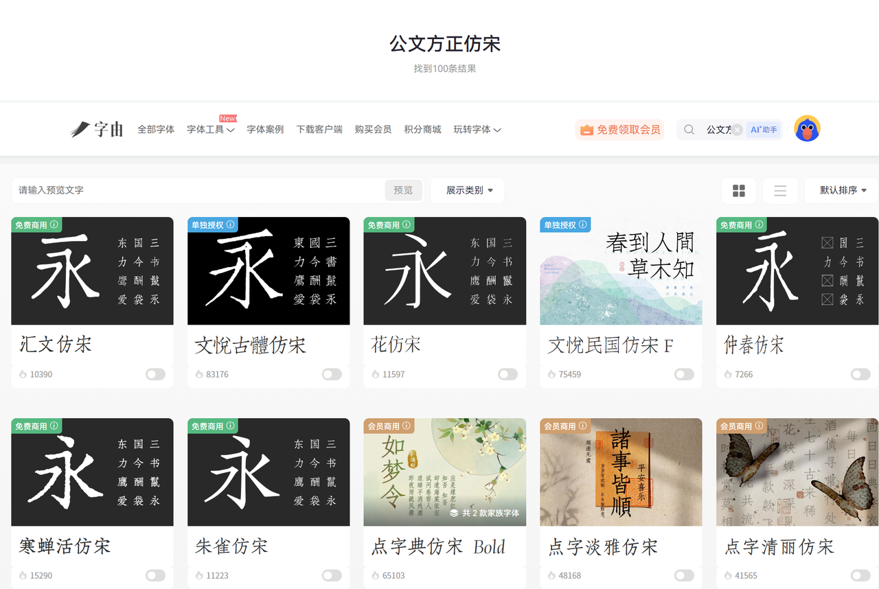 筛选技巧:公文排版优先选择“免费商用”标签的字体,规避版权风险;在字由网上每个字体都会在图片左上角标注是否能免费商用。