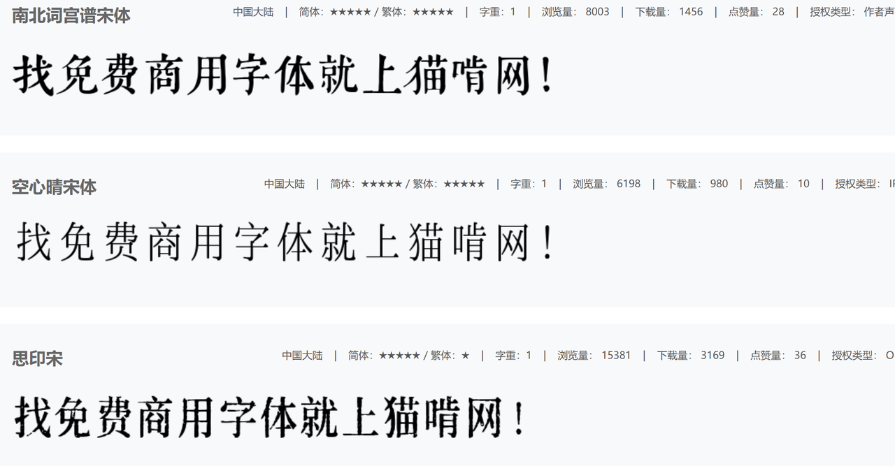 猫啃网是国内少有的专注中文免费商用字体的平台,目前已汇总近千款优质字体,其中标准宋体资源尤为丰富。网站界面简洁无广告,直接按“衬线体”分类就能快速定位到各类宋体,每款字体都附带详细的授权说明,部分热门字体还支持在线开具授权证书,面对客户或平台审核时可直接出示。