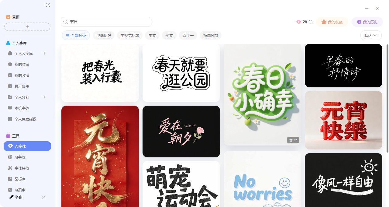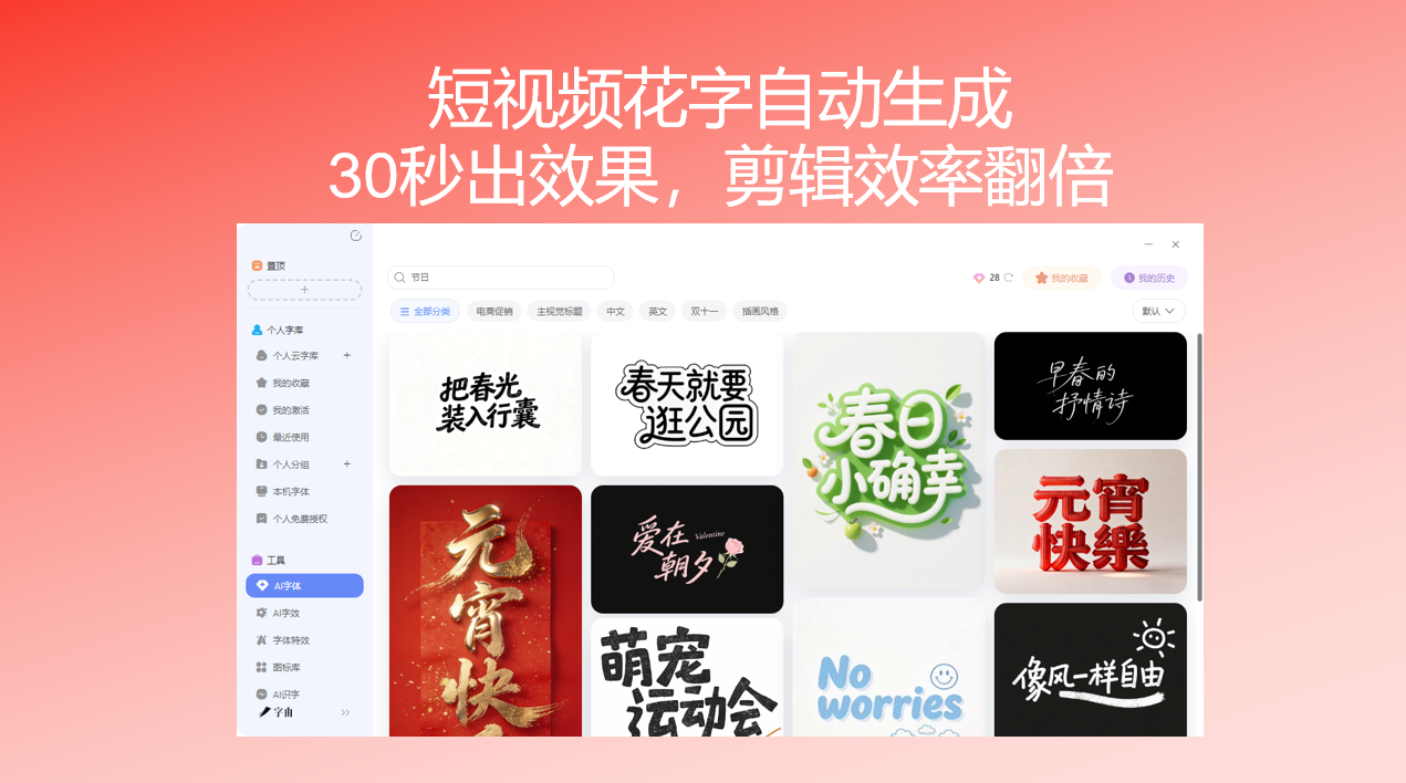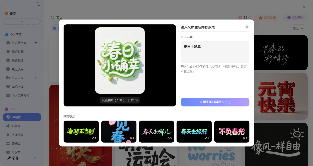 第一步:进入AI字体页面后,在搜索框里输入“春日”“节日”“生活”“动态”等关键词,系统会自动筛选出所有适合做花字的模板。
