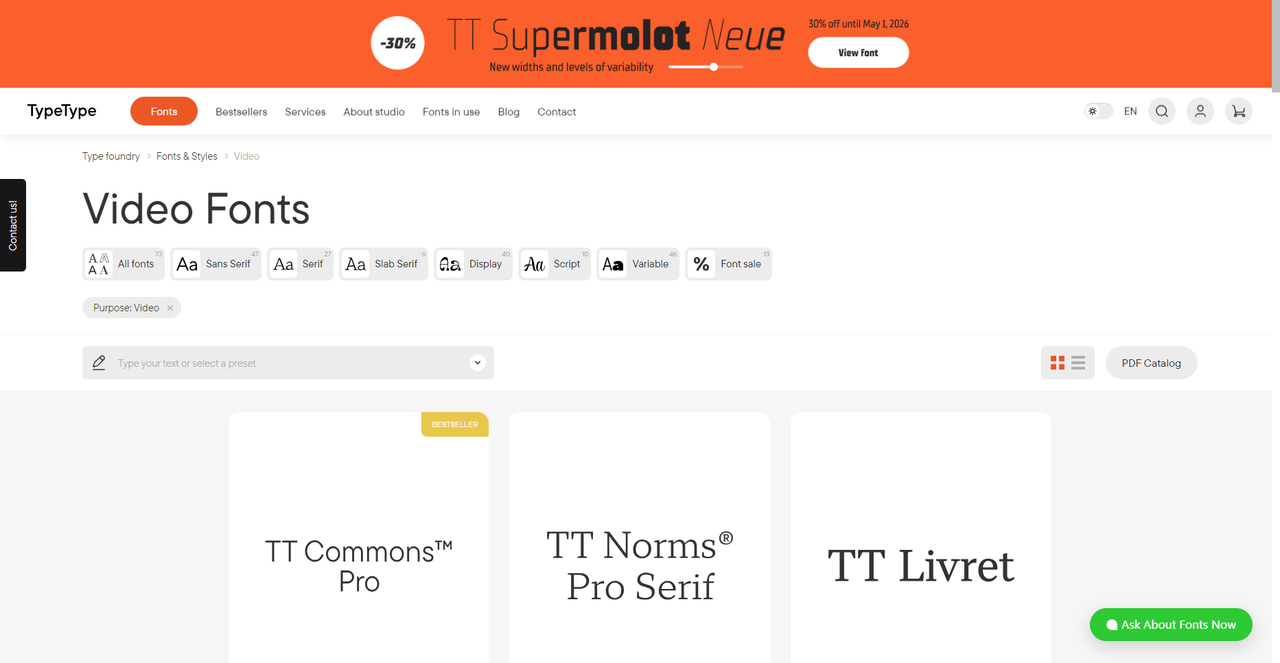 TypeType 是一个专业的字体设计公司,它专门有一个“Video Fonts”分类。它推荐了多款适合视频使用的字体,每款都强调在多场景下的可读性和表现力: