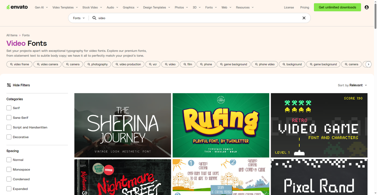 Envato Elements 是一个设计资源平台,它的“Video Fonts”分类收录了大量适合视频使用的字体。从截图看,它推荐了多款热门字体,每款都有详细的风格标签和预览。这些字体很多包含在Envato Elements的订阅中,可以无限次下载使用。如果你需要大量视频资源,这里是个宝藏库。