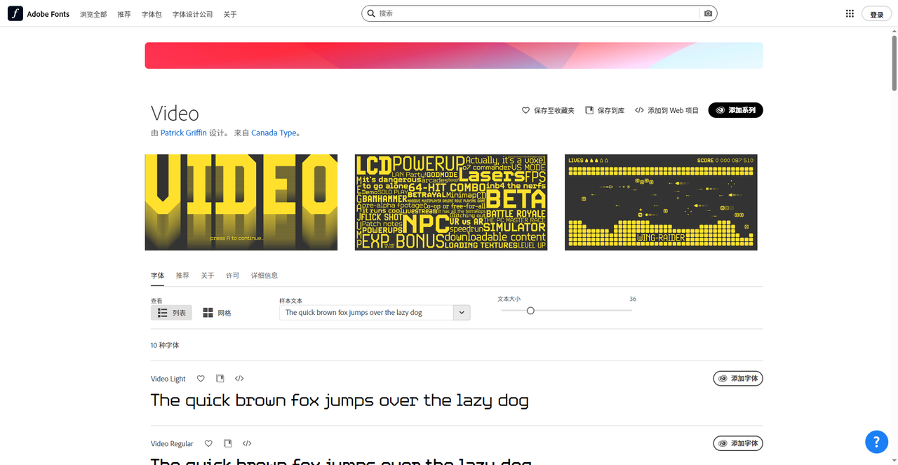 Adobe Fonts 是Adobe的字体库,它的“Video”系列字体专为视频设计。它展示了一款名为 Video 的字体家族,由Patrick Griffin设计,来自Canada Type。这款字体包含10种字重,从Light到Bold,覆盖了视频中可能用到的各种场景。