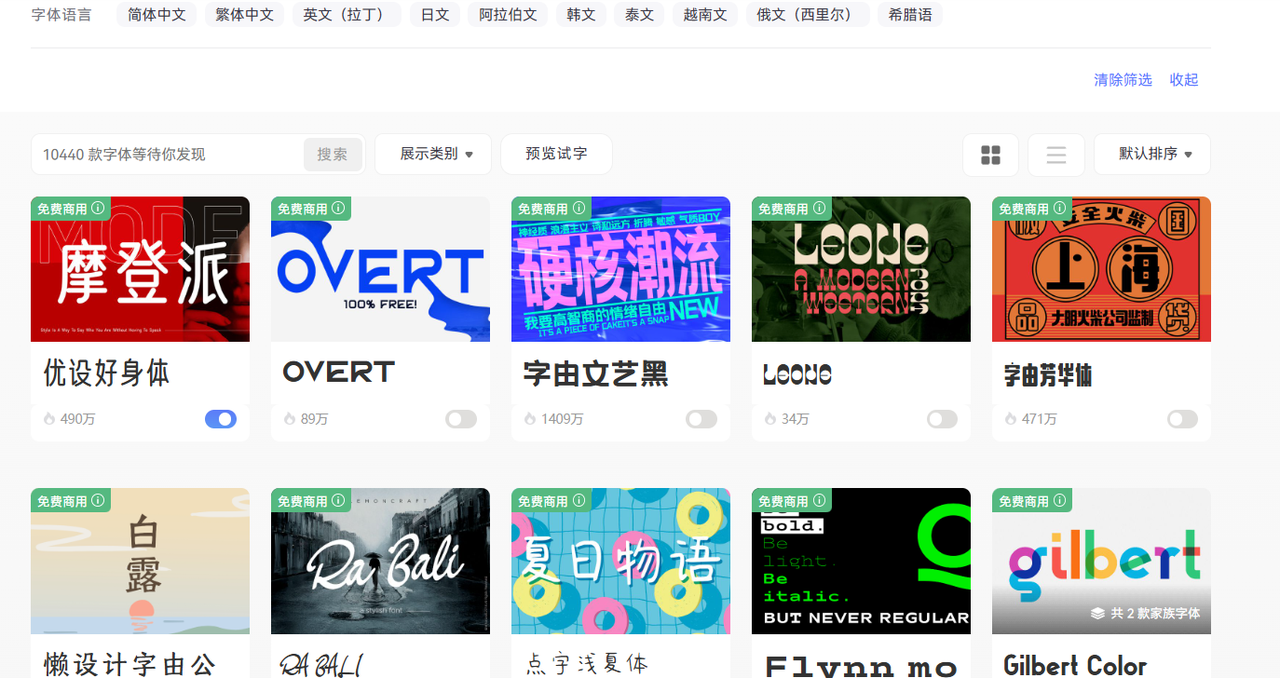 首先是字体素材,字由站内汇集了上万款精品字体素材,其中有 3000+ 款支持免费使用,像常用的思源黑体,优设好身体,阿里妈妈东方楷体等常用的字体素材,都可以在字由中下载并免费使用。除此之外还有一些常用的英文字体,日文,韩文,俄文甚至希腊文,阿拉伯文等语言的字体,字由站内均有提供,并且拥有正版授权,无需担心发生侵权风险。