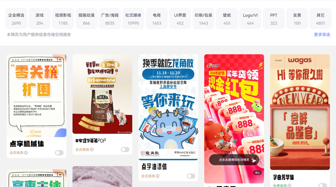 其次是网站功能方面,字由站内提供了多种可以节省工作量的字体功能,比如 “AI 配字”,“AI 擦除”,“AI 识字” 等。如果你在网站中的上万种字体素材中找不到创作灵感的话,可以看一下字由站内的【字体案例】区域,这里将字体素材按照常用的设计场景进行了再次分类,比如海报常用字,UI 界面常用字,电商常用字,LOGO 设计常用字等等,这里提供了一些精品设计案例,新手没有创作思路或者没有创作灵感的时候,可以来这里看看。