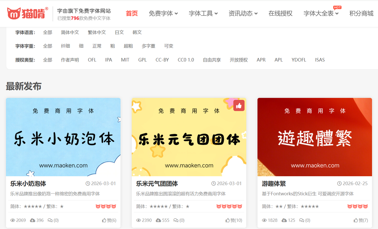 猫啃网目前共收录了近800款免费的字体,每款字体标注来源、授权类型、商用范围,避免侵权风险。