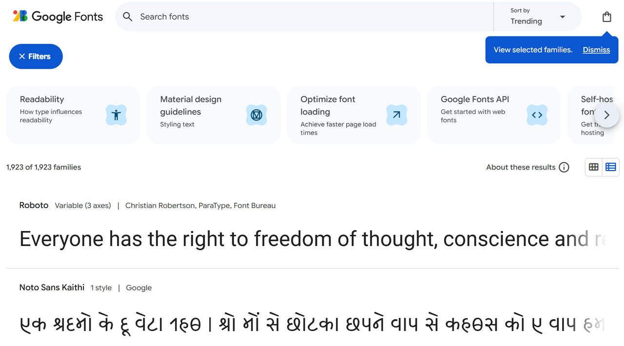 这是我最常去也是最推荐的免费字体网站之一!它拥有庞大且不断更新的字体库,所有字体都可以免费下载和使用,并且支持多种语言。最重要的是,Google Fonts的字体质量非常高,设计精良,而且对Web端友好,非常适合网页设计和各种数字项目。它的搜索和筛选功能也很强大,你可以根据字重、风格、粗细等来查找。