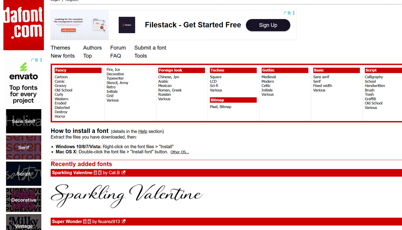 DaFont是一个非常老牌的免费字体网站,上面有大量的字体,尤其是各种创意、手写、装饰字体。你可以在这里找到很多非常有个性的字体,适合那些想要在设计中加入独特元素的朋友。不过,在DaFont上下载字体时,一定要仔细查看每个字体的许可证,很多都是仅限个人使用的。