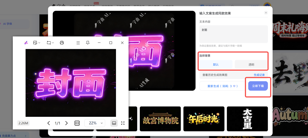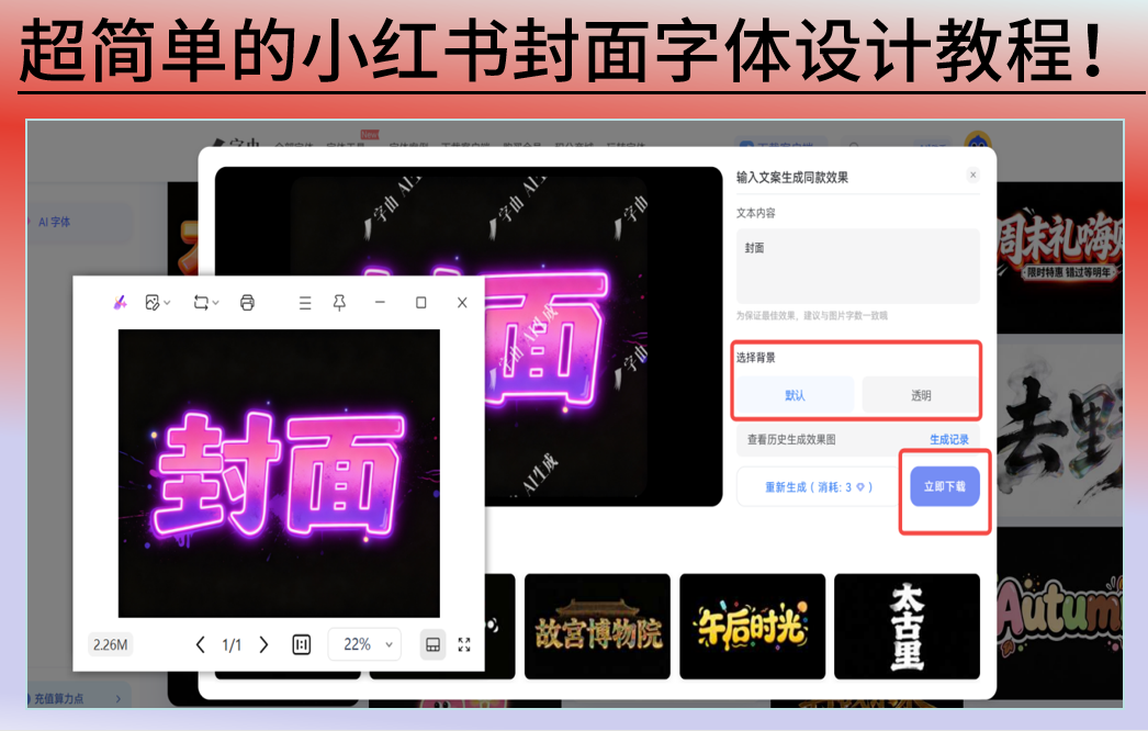 以上就是本文想提供给大家的小红书封面字体设计的邪修教程了,本文完成封面字体设计主要是借助了字由的【AI 字体】功能。无需掌握专业字体使用操作技能,无需访问 Github 调试代码,在字由【AI 字体】界面中,只需要挑选喜欢的字体设计,然后 “做同款”,25 秒左右就能拥有同样的字体设计效果。不管是有资历的设计师,还是不熟悉字体设计的新手小白,我认为【AI 字体】都可能做为一款提升字体设计效率的工具使用。想拥有精美的字体设计效果,想打造小红书爆款笔记,欢迎前往体验字由【AI 字体】功能。