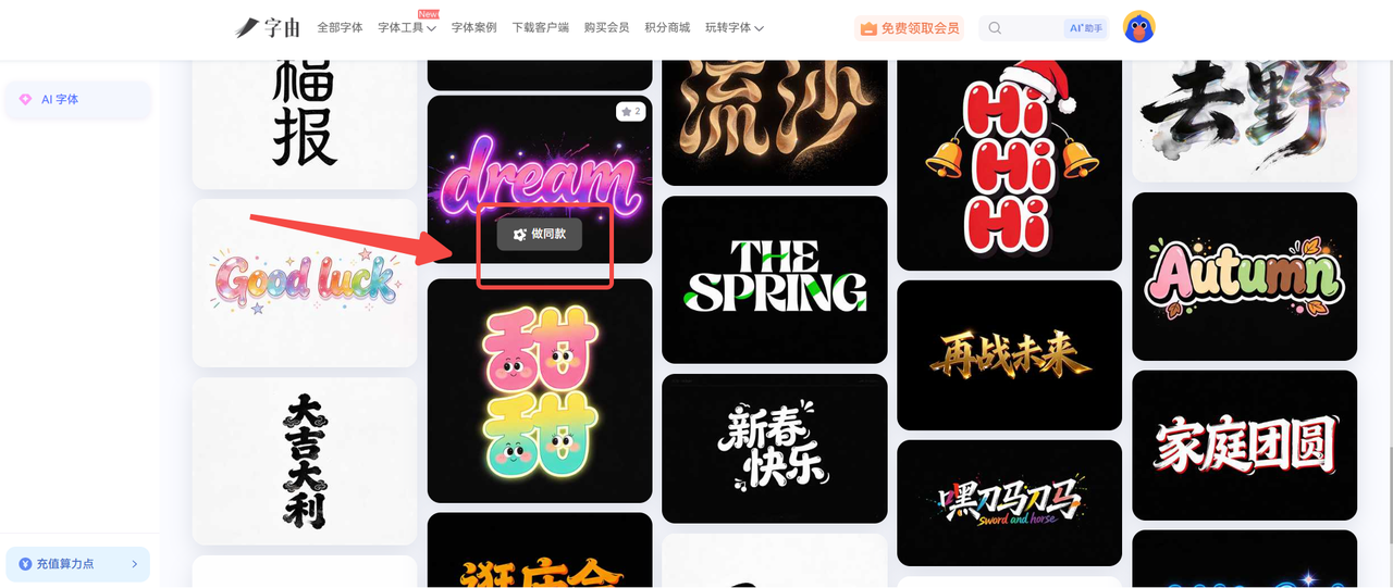 笔记封面做为给用户呈现的第一道信息,封面设计十分重要,尤其是在小红书这一类比较依靠笔记质量的社媒平台中。而想为封面打造独特的字体设计,抓住用户的注意力,推荐你来尝试一下字由新上线的 “AI 字体” 功能。做为一个有资历,有经验的字体网站,字由除了提供传统的用字方法之外,还上线了 “AI 字体” 功能。不管是社媒字体,还是电商字体,多种字体多种风格,字由均支持一键 Get “同款”。以下是在【字由】中生成独特小红书封面字体的教程,一起往下看吧!