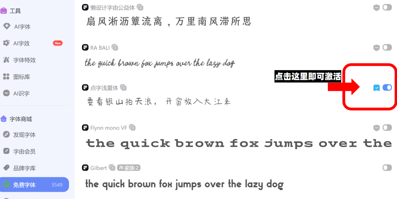 第一种方法非常简单,下载好客户端后,找到喜欢的字体,直接点击字体右侧的激活就可以使用啦~但是要注意字体是否可以免费商用哦!