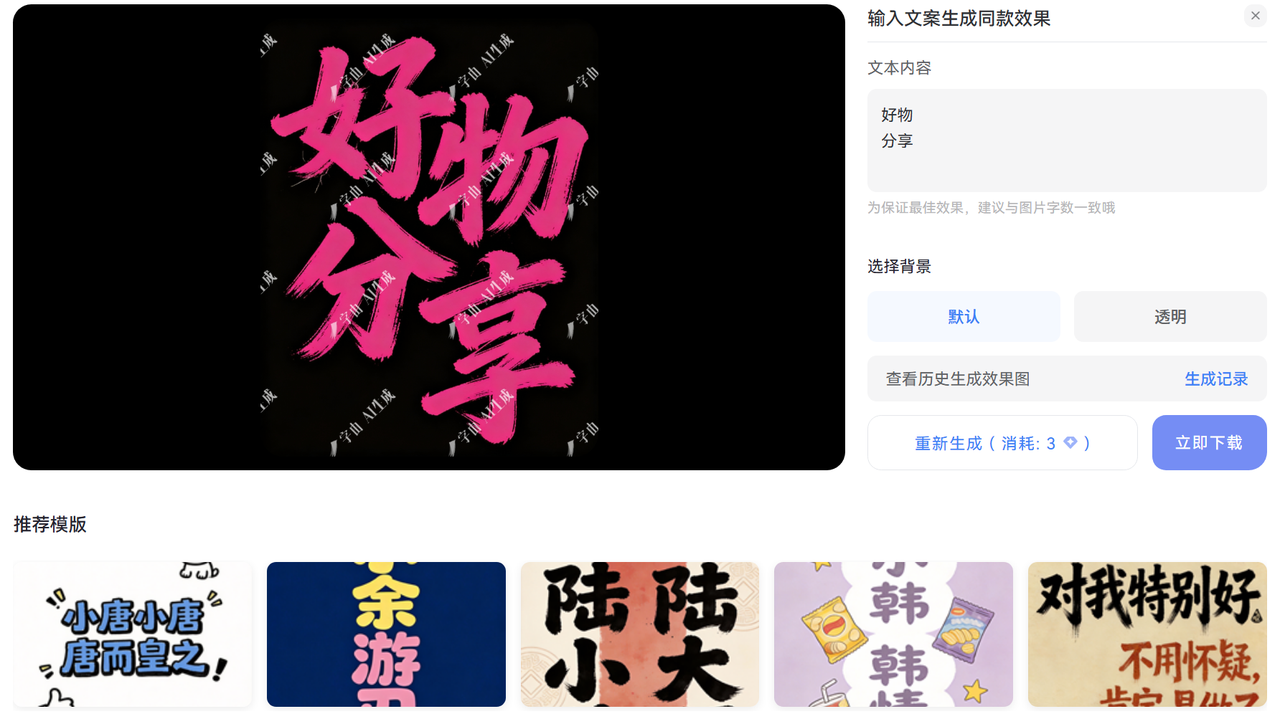 输入你想做的封面文案(比如“美妆好物合集”“职场干货分享”),筛选对应风格模板后点击生成,就能拿到高清字体。