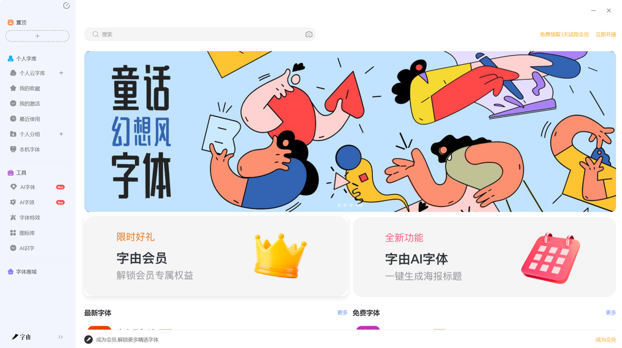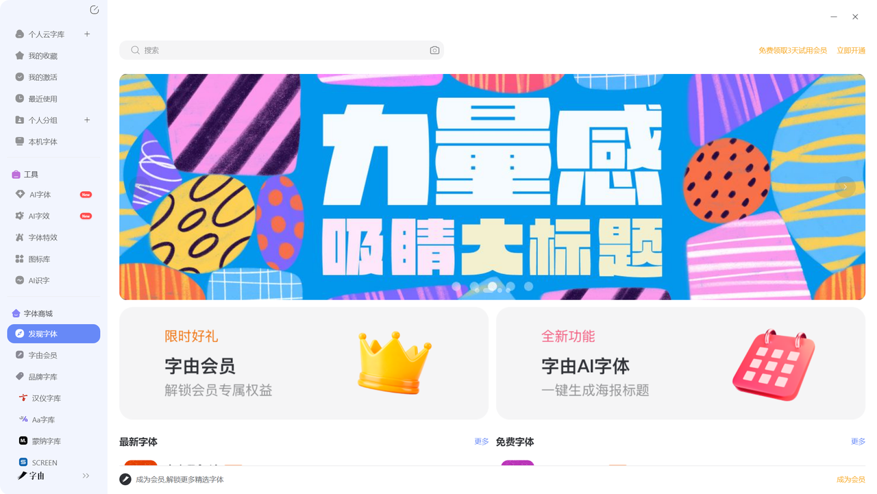 顶部是搜索框,可以快速搜索字体名称或关键词。旁边还有开通会员的快捷入口。