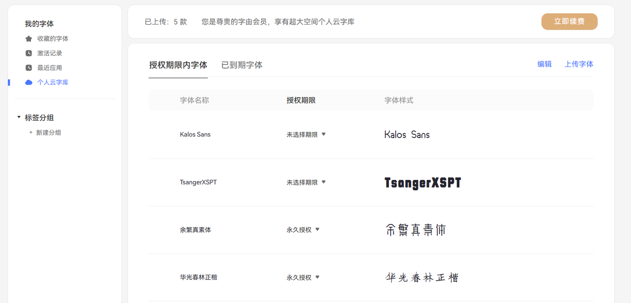 - 上传本地字体:把你多年收藏的字体文件上传到云端,支持批量上传。