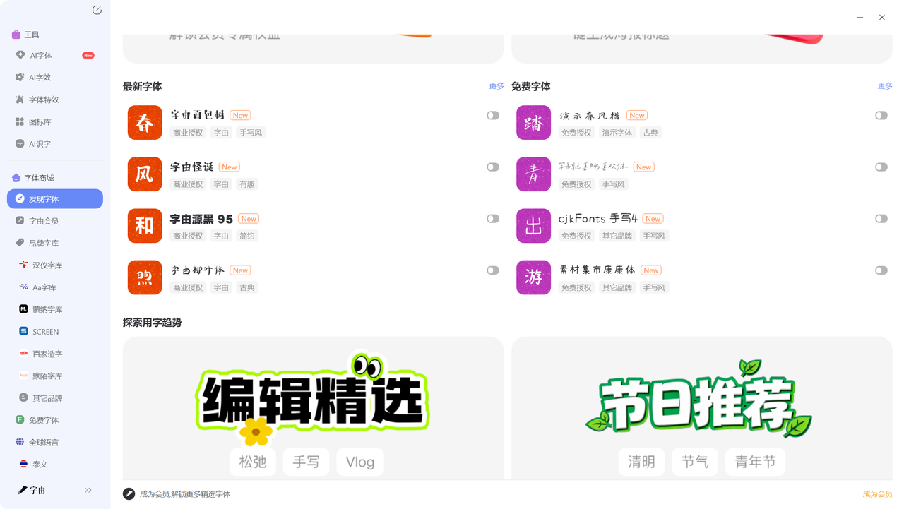 - 字体商城:可以浏览最新字体、热门字体,还有会员专享字体。不过不用担心会员问题,一般的免费字体足够你使用,而且会员也并不是强制消费,可以根据自身需求自行选择。