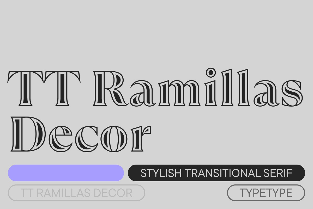 TT Ramillas is a stylish transitional serif perfectly adapted to modern reality and requirements. The idea behind this project was to experiment: we aimed to craft a modern serif with precisely balanced details by rethinking traditional forms and meticulously designing each glyph. And we achieved it! TT Ramillas includes decorative subfamilies, Outline and Decor, which work perfectly for headlines and eye-catching, accentuated short texts.