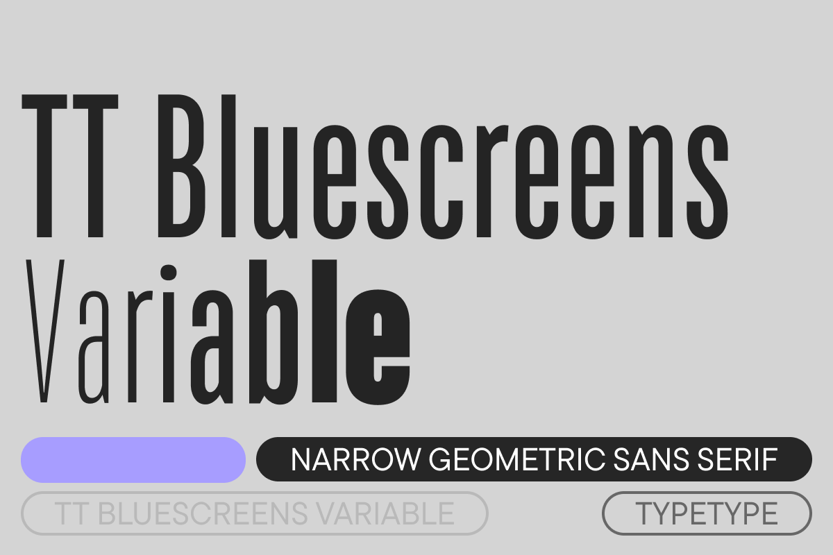 TT Bluescreens is a Neo-Grotesque typeface with narrow proportions and a calm, neutral yet distinctive character. This balance makes it highly versatile. At medium sizes, the font gains texture and can serve as a visual accent. In large sizes, it appears unusual and expressive while preserving excellent readability, making it suitable for a range of design tasks. TT Bluescreens includes a variable font that now has three axes of variation: weight, width, and slant.
