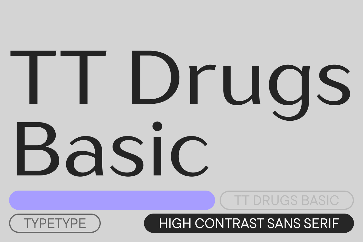 TT Drugs is a typeface that doesn’t feature serifs but stands out for its high contrast. Its narrow terminals lend an elegant and sophisticated appearance. The typeface’s name reflects the story of its creation: the font family was initially intended to be used for the pharmaceutical industry. However, in practical use, the font revealed its multiple dimensions and seamlessly blended with differently themed projects.
