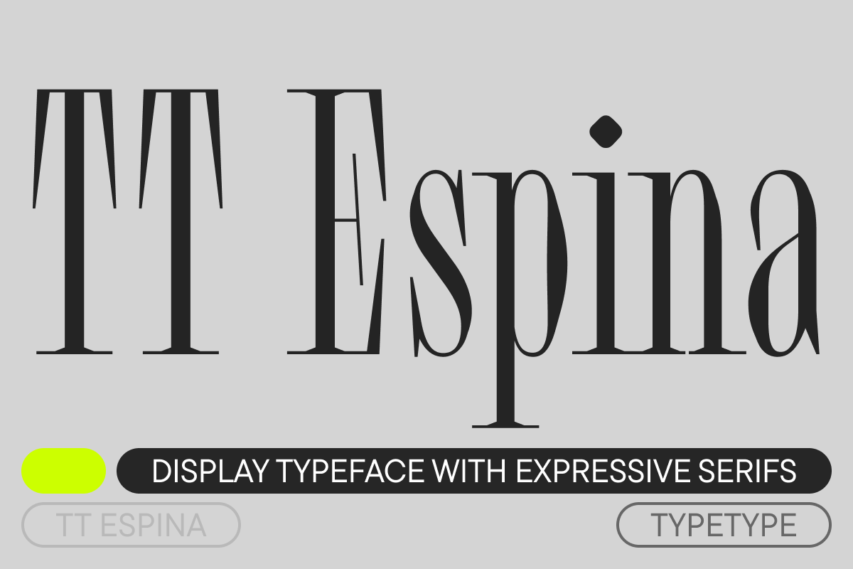 TT Espina is a display Antiqua with expressive serifs. It is a modern typeface with high contrast between horizontal and vertical strokes. TT Espina is yet another proof that serifs can be stylish and expressive display fonts suitable for contemporary projects. This font is an excellent choice for poster headlines, billboards, gallery and exhibition designs, large-format printed materials, and websites.