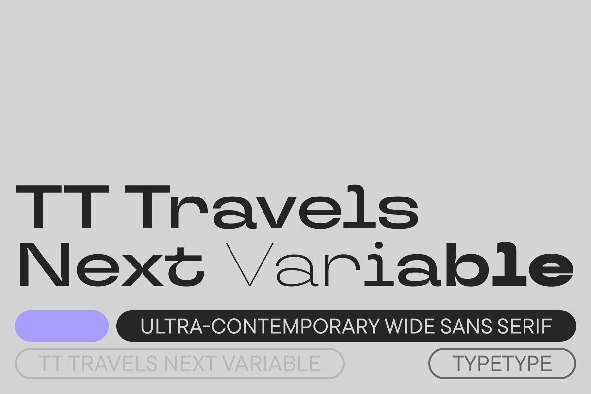 TT Travels Next is an ultra-modern, wide sans serif. Wide proportions are one of the typeface’s distinctive features: there is almost no glyph narrowing when transitioning from bold to thin font styles. Besides, the font stands out for its extra closed aperture, low contrast, and noticeable ink traps. Interestingly, TT Travels Next does an exceptional job blending smooth and sharp forms, which makes it highly versatile, unusual, and attractive.