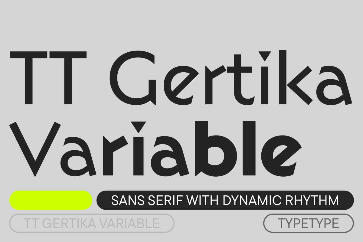 TT Gertika is a geometric sans serif with a dynamic character and a dancing rhythm. This font’s idea originates from the lettering featured on an American poster from the late 1930s. We saw many peculiar and eye-catching details in the letters and decided to reimagine them. As a result, we got a font that alludes to something ancient and primitive while still being modern.