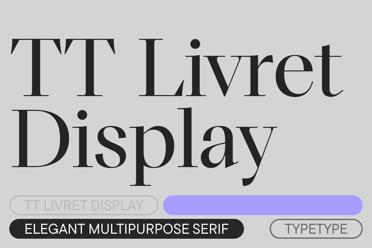 TT Livret is an elegant, modern, and functional serif featuring both text and expressive display subfamilies. The font looks harmonious in books and other periodicals, on posters, and on magazine covers. The use range of TT Livret goes far beyond the printing industry, as this font gives an aesthetic look to any text typed in it. The sleek Display subfamily boasts dynamic proportions, highly circular forms of round characters, dense spacing, and closed apertures.